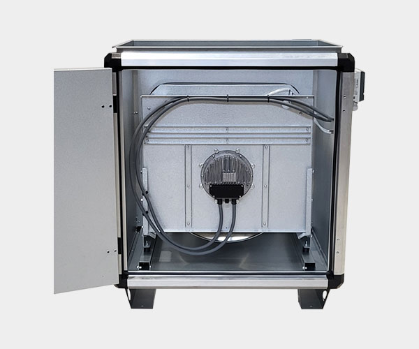KANAL är en fläkt avsedd för kanalanslutning av ut- och/eller inlopp. Fläkten är isolerad med 50 mm mineralull och hela insidan är plåtinklädd. Genom att stativet med vibrationsdämpare är monterat inne i lådan behövs inga dukstosar och dämpare på utsidan. KANAL finns i två huvudutförande, med dörr på gavel och med dörr baktill. Utloppet går att flytta, se beskrivning i PDF-fil under fliken ritning. Underslagen kan monteras bort om intransportvägen eller utrymmet där fläkten skall monteras är trångt.Specifikation